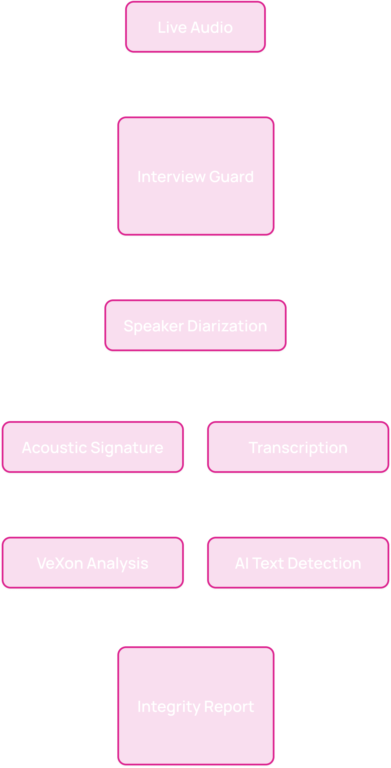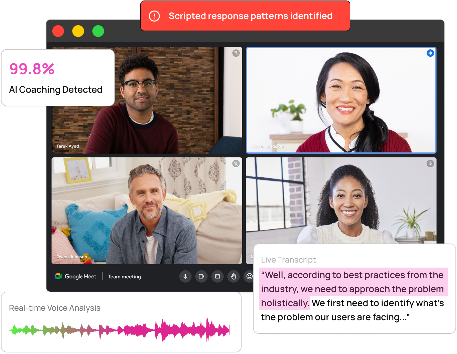 We analyze speech patterns, timing, and linguistic markers in real-time transcribed conversations to identify signs of external assistance or coached responses. We use advanced machine learning models trained on.