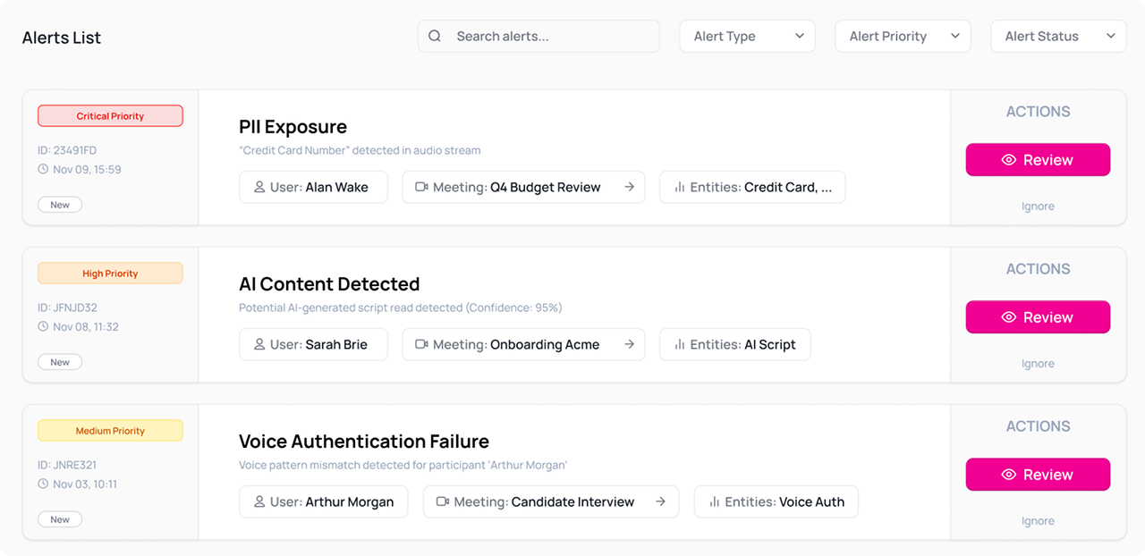 Get instant alerts, detailed meeting transcripts with threat highlights, and comprehensive reports for compliance and review.