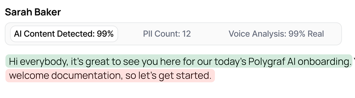 Three engines scan every speaker for AI content, deepfake voices, and PII leaksβwith instant alerts and confidence scores during live calls.